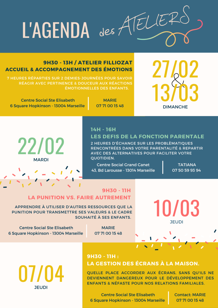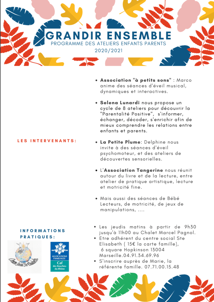 Malgré ce Covid et les nombreuses restrictions auxquelles nous sommes tous confronté, il y a aussi de beaux projets qui voient le jour comme celui-ci 🙂 Dans le cadre d’un projet REAAP, je suis très heureuse d’intervenir très prochainement au Centre Social Ste Elisabeth à Marseille, pour une série de 8 ateliers parents/enfants. Voici le programme :