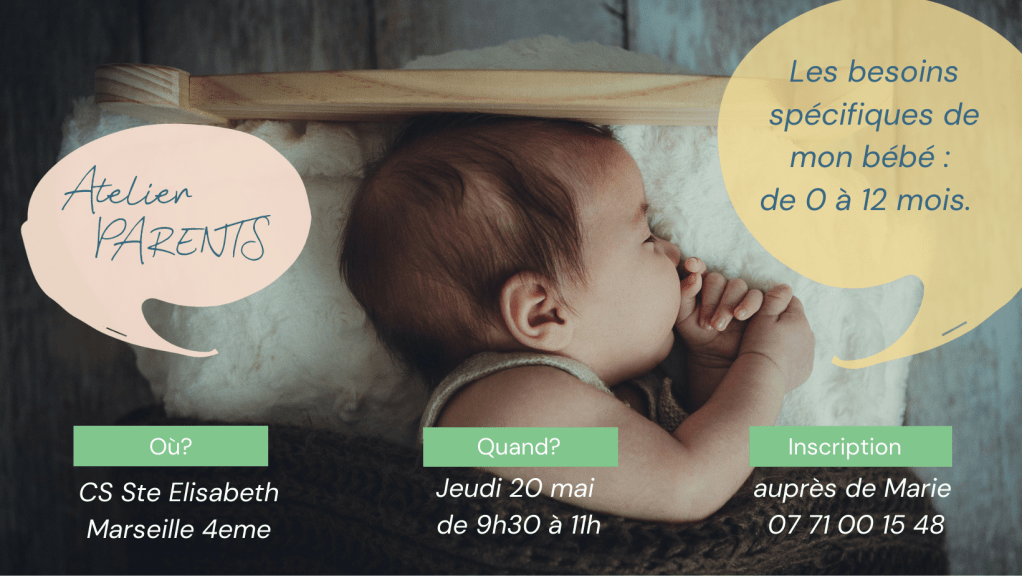 Les besoins spécifiques de mon bébé (0-12 mois), c’est le thème du prochain atelier parents/enfants qui se déroulera à Marseille au Centre Social Ste Elisabeth.